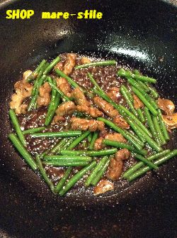 (4)にんにく、お肉、にんにく芽を炒めます。